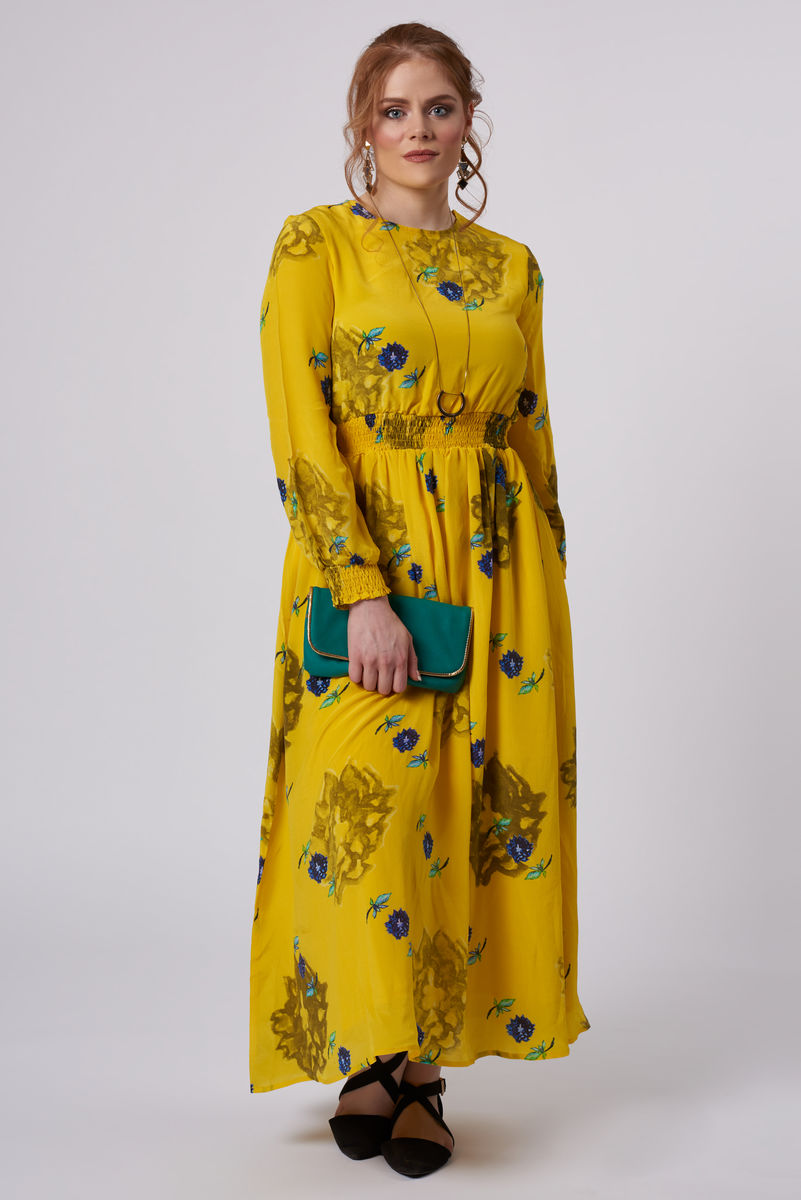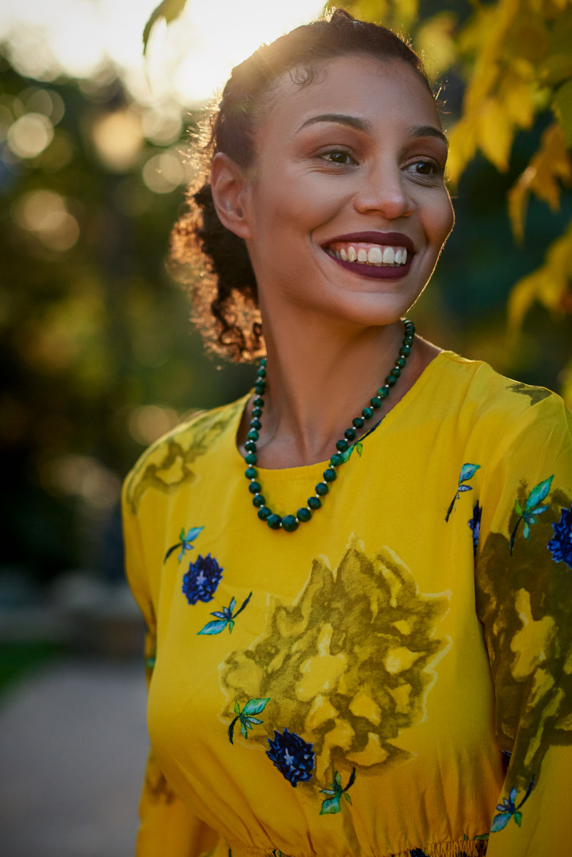 Here, this dress has been accessorised with a teal beaded necklace, complementing the colours of the print. Wear with a messy bun hairstyle and grey flat shoes in the day time for a casual yet eye-catching look.